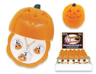 Halloween necklace and earrings in a cute pumpkin box. Warning Choking Hazard! Contains small parts, not for children under 3........