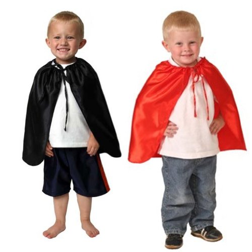 Satin capes for theme birthday parties and dressup! Perfect for theme parties - superhero, dracula, Halloween, and other themes. Ideal for a party favor. Polyester satin cape measures 20" long. Imported. Lot includes 6 red and 6 black........